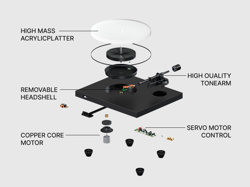 The Luna3 features a high-mass acrylic platter to reduce vibration for smoother playback. A precision tonearm ensures accurate tracking, while the removable headshell allows easy upgrades. Its copper motor with servo control maintains stable speed for natural, detailed sound.