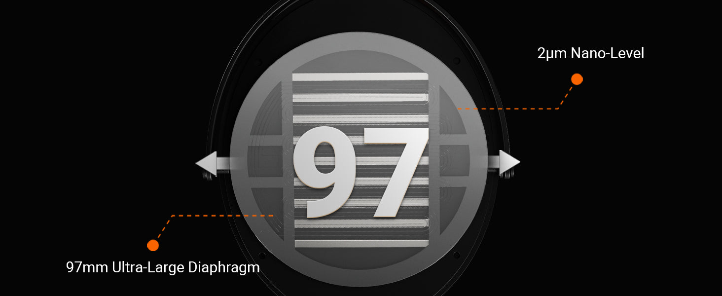 • 97mm Ultra-Large Diaphragm : Industry-leading 97mm driver at 2μm thickness reveals microscopic details. Magnetron-sputtered silver alloy coating enhances clarity while ensuring long-term sonic consistency and durability