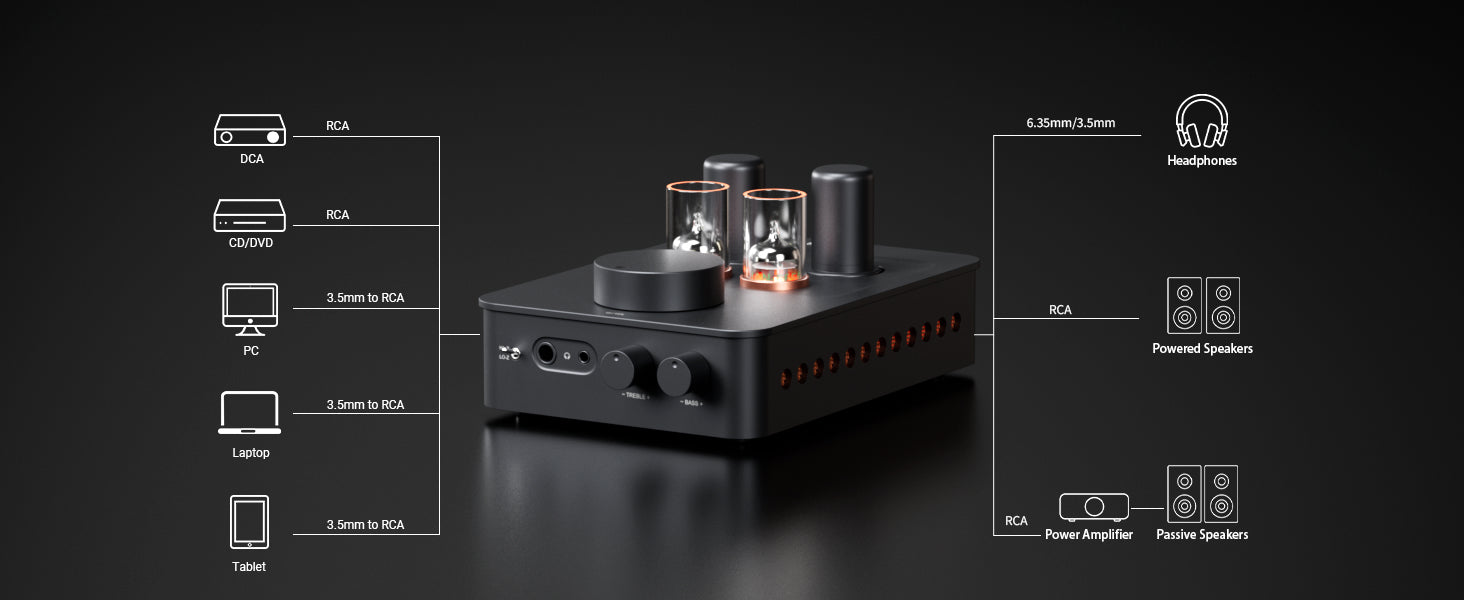 - Two-in-One: It supports low and high impedance modes switching to adapt 16Ω-300Ω headphones, and features 6.35mm/3.5mm headphone jacks on the front and RCA Input/Output on the rear for home audio HiFi system integration