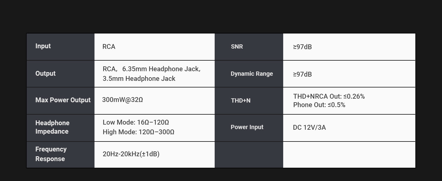 - Input: RCA; Output: RCA, 6.35mm/3.5mm Headphone Output;