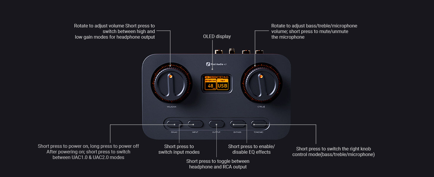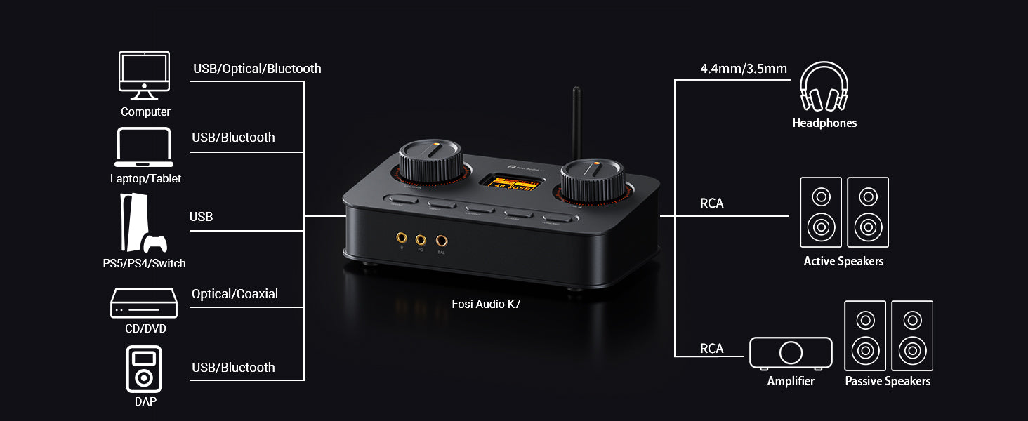 - Versatile DAC Amp: The K7 is designed for both HiFi headphone audiophiles and music lovers. It can serve as a powerful hub for building your desktop audio system. Whether your're enjoying music, gaming or working, the K7 handles it all with ease.