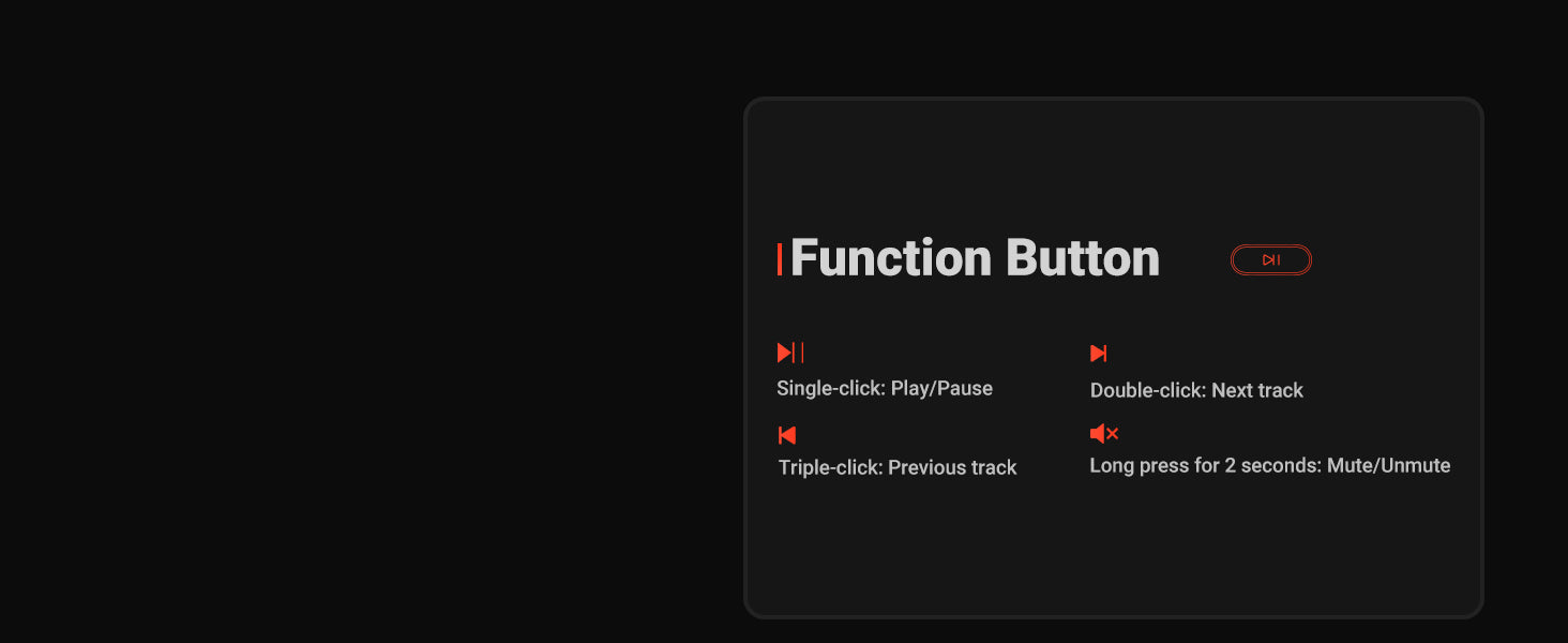 - Functions: Volume Up/Down; Previous Track/Next Track; Play/Pause; Mute/Unmute