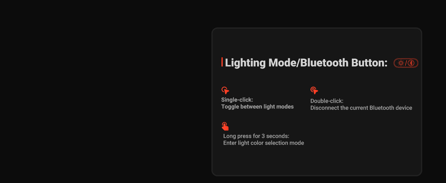RGB Lighting: Offers constant on, auto-off after 5 seconds, spectrum cycling, and off modes. Four modes at your fingertips—freely switch between colors and lighting modes to create the perfect ambiance just the way you like it